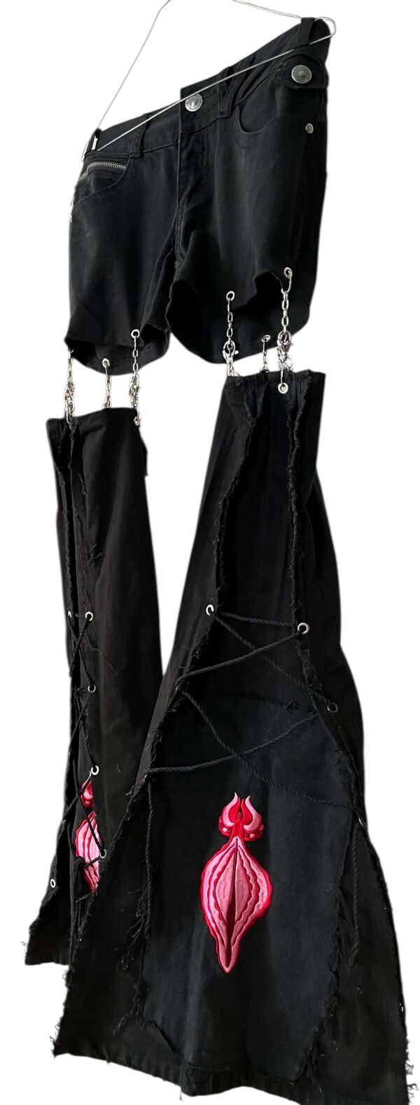 3 in 1 Black bootcut jeans. Due to chains its convertible into shorts and also the leg is convertible into a straight leg due to laced up sides.